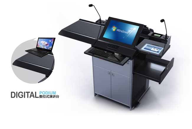 数位讲台融电脑技术、触摸技术、自动化控制技术于一体,可同步处理视频、音频图片、文字等信息,可根据人性化实际需求自动调节高度。全新数字化演讲环境,将是您的演讲更加精彩。
