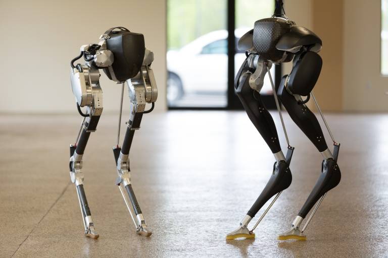 第一个学会跑步的双足机器人Cassie,是由一支来自俄勒冈州立大学的工业设计队伍设计的仿生鸵鸟机器人,Cassie和Atlas机器人虽然很相像,但是在设计的思路上是完全不同的;例如,Cassie的腿和Atlas的腿很不一样,直观来看,Cassie的膝盖是向后弯的,有点类似于鸵鸟,而非人类的膝盖设计;除了“膝盖”Cassie在设计上还有类似鸟类的骨盆,髋部、和金属足,两条腿各有5个电机,同时Cassie髋关节有3个自由度,可以前后左右摆动及自转,所以即便Cassie没有上半身,Cassie还是非常灵活的;另外,工业设计师设计了Cassie独特的腿部结构,这样的腿部结构设计使得Cassie的电机体积更小,这样的设计使得Cassie那两条优美的“大腿”不仅能够适应各种坎坷的环境,还能够像人类一样玩平衡车甚至还能在雨中撑伞前行。