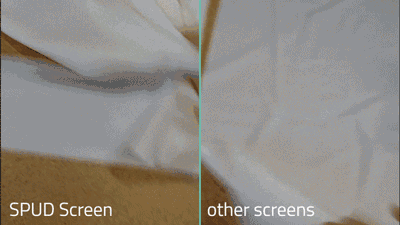 SPUD 不同于传统的光学投影仪,它通过后置投影仪把图像投射到乙烯基复合显示屏上,提供超清晰图像; SPUD 不需要昏暗的灯光条件,不需要一堵墙,也不需要一段固定的投影距离;并创造了革命性的创新成果:绝对无褶皱投影显示屏、可折叠设计、自行研发的光学规律;同时 SPUD 还支持有线和无线两种连接方式;在户外使用起来十分便捷。
